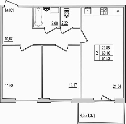 2-комнатная квартира, этаж 1, площадь 61,53 м²