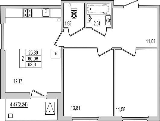 2-комнатная квартира, этаж 2, площадь 62,3 м²