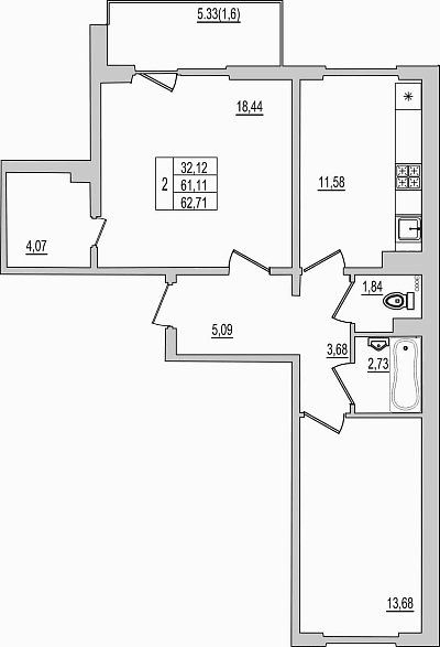 2-комнатная квартира, этаж 6, площадь 62,71 м²