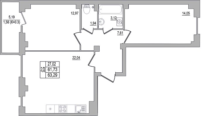 2-к. квартира, 63.29 м², 2/10 эт.