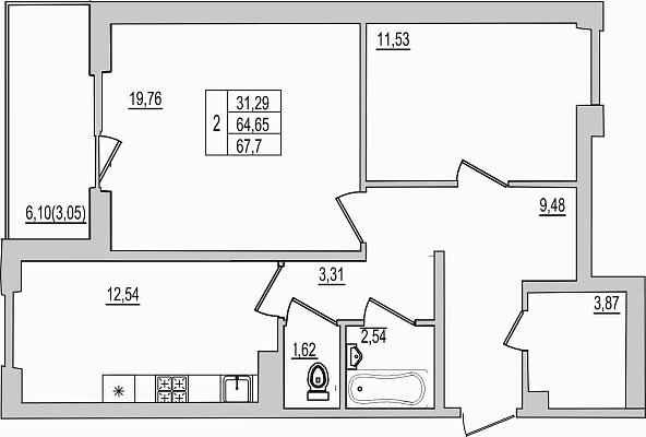 2-комнатная квартира, этаж 5, площадь 67,7 м²