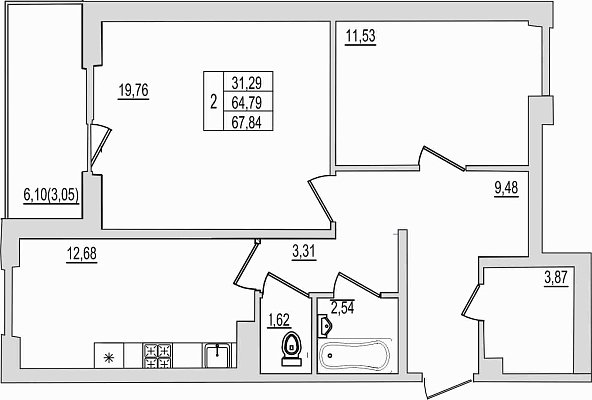 2-комнатная квартира, этаж 4, площадь 67,84 м²