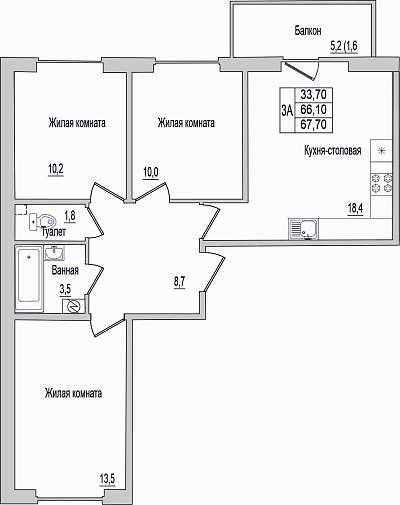 3-комнатная квартира, этаж 1, площадь 67,7 м²