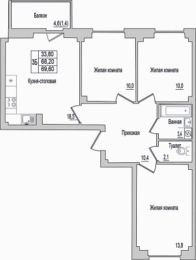 3-комнатная квартира, этаж 2, площадь 69,6 м²