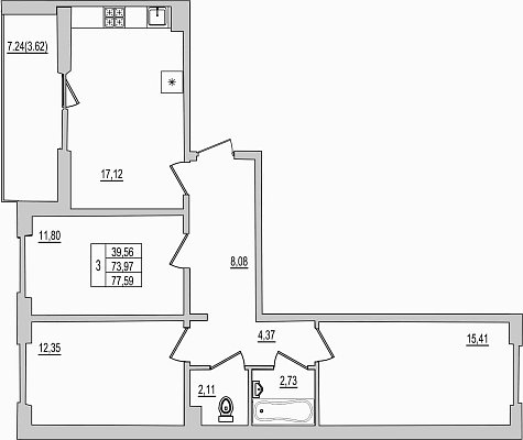 3-комнатная квартира, этаж 10, площадь 77,59 м²