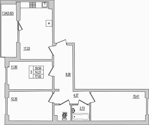 3-комнатная квартира, этаж 4, площадь 77,83 м²
