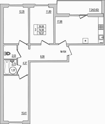 3-комнатная квартира, этаж 1, площадь 78,57 м²